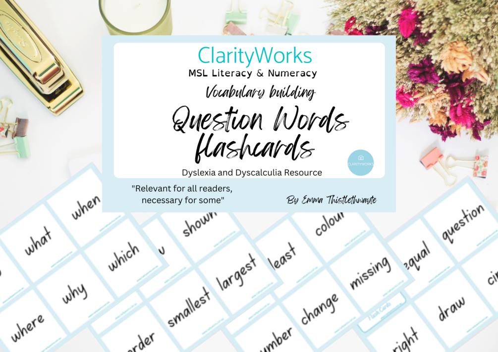 Question Words: Vocabulary building flashcards for dyslexia and dyscalculia